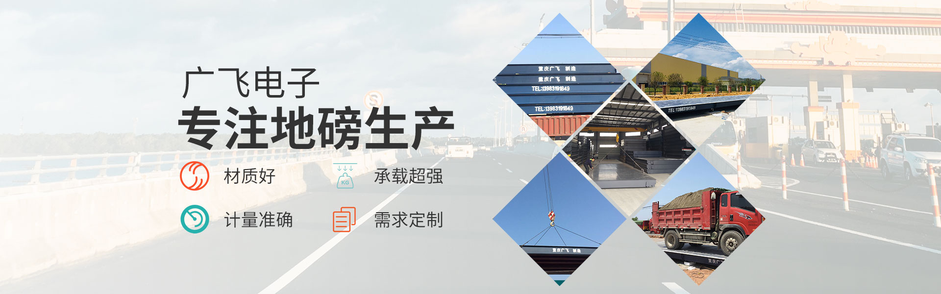 重慶廣飛電子有限公司,是一家集衡器生產、技術研發(fā)、產品銷售及售后服務于一體的高科技企業(yè)。 產品囊括電子汽車衡(電子地磅)、無人值守地磅稱重管理系統、電子地上衡、智能稱重管理系統、電子軌道衡、電子吊秤、電子臺秤、電子皮帶秤、鏟車秤、公路超載超限系統等全系列稱重產品。